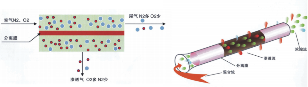 膜分離制氮機技術(shù)是根據(jù)空氣中的氮氣和氧氣在膜兩側(cè)壓差作用下,在膜中的溶解度和擴(kuò)散系數(shù)不同而實現(xiàn)分離的,滲透率快的水蒸汽、氧氣等一些氣體先透過膜,成為富氧氣體,而滲透率較慢的氮氣則滯留富集,成為干燥的富氮氣體,達(dá)到氧氮分離的目的。