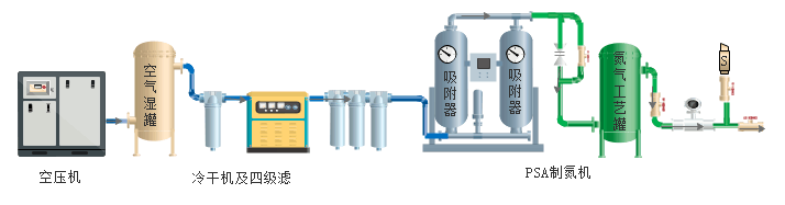 空壓機(jī)→空氣緩沖罐(濕罐)→C級過濾器→冷凍式干燥機(jī)→T級過濾器→A級過濾器→H級過濾器→制氮機(jī)主機(jī)→氮氣流量,純度,壓力檢測→氮氣儲氣罐→使用點