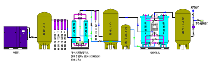 環(huán)境空氣經(jīng)壓縮凈化,除去油、水、塵后,進入由兩個裝填有碳分子篩的吸附塔組成的變壓吸附裝置。壓縮空氣由下至上流經(jīng)吸附 塔,其間氧分子在碳分子篩表面吸附,氮氣由吸附塔上端流出,進入粗氮緩沖罐,經(jīng)過一段時間后,吸附塔中碳分子篩被吸附的氧飽和,需進行再生。再生是通過停止吸附步驟,降低吸附塔壓力來實現(xiàn)的。兩個吸附塔交替進行吸附和再生,從而確保氮氣的連續(xù)輸出。