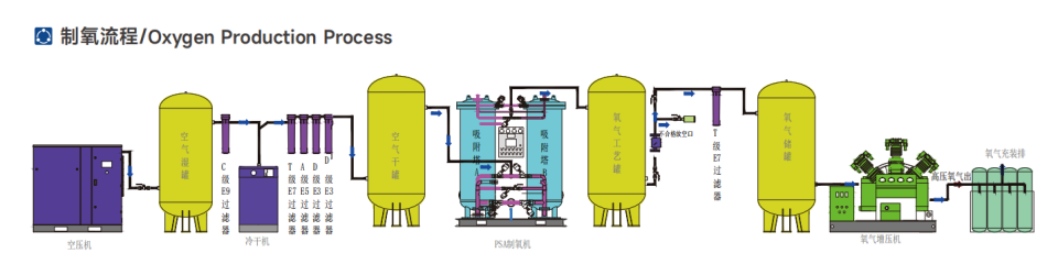 變壓吸附制氧裝置以潔凈的壓縮空氣為原料,采用高品質(zhì)的沸石分子篩作為吸附劑,在一定的壓力下,從空氣中制取氧氣。經(jīng)過純化干燥的壓縮空氣,在吸附器中進(jìn)行加壓吸附、減壓脫附。由于空氣動力學(xué)效應(yīng),氮在沸石分子篩微孔中擴(kuò)散速率遠(yuǎn)大于氧,氮被沸石分子篩優(yōu)先吸附,氧在氣相中被富集起來,形成成品氧氣。然后經(jīng)減壓至常壓,吸附劑脫附所吸附的氮?dú)獾入s質(zhì),實(shí)現(xiàn)再生。一般在系統(tǒng)中設(shè)置兩個吸附塔,一塔吸附產(chǎn)氧,另一塔脫附再生,通過PLC程序控制器控制氣動閥的啟閉,使兩塔交替循環(huán),從而取得純度較高的氧氣(93%±3%)。